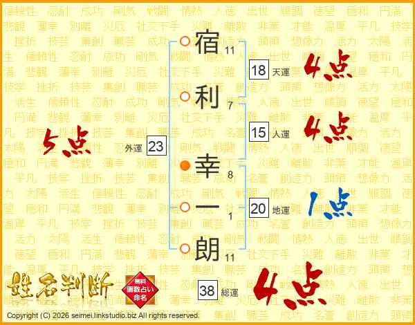 宿(11画)利(7画) 幸(8画)一(1画)朗(11画)