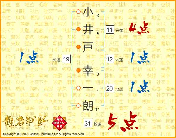 小(3画)井(4画)戸(4画) 幸(8画)一(1画)朗(11画)