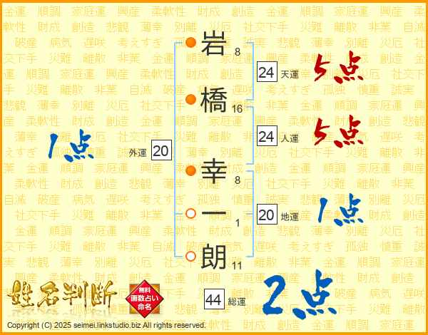 岩(8画)橋(16画) 幸(8画)一(1画)朗(11画)