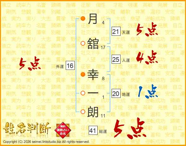 月(4画)舘(17画) 幸(8画)一(1画)朗(11画)