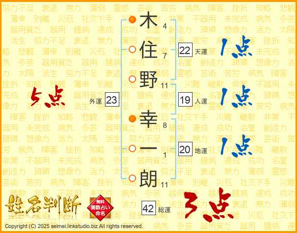 木(4画)住(7画)野(11画) 幸(8画)一(1画)朗(11画)