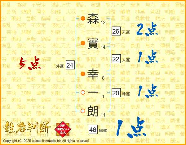 森(12画)實(14画) 幸(8画)一(1画)朗(11画)