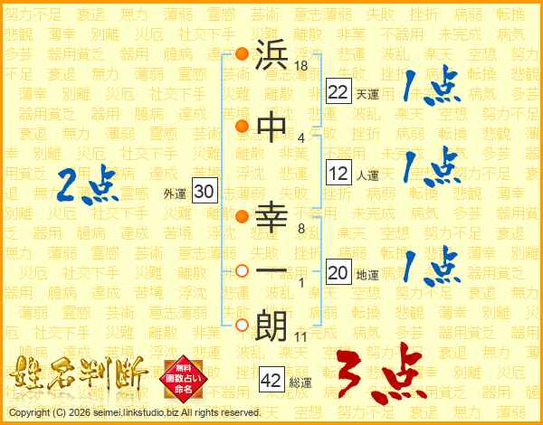 浜(18画)中(4画) 幸(8画)一(1画)朗(11画)
