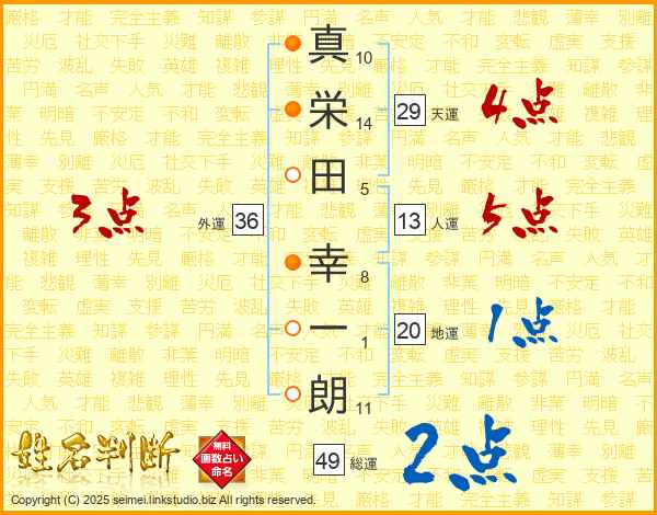 真(10画)栄(14画)田(5画) 幸(8画)一(1画)朗(11画)