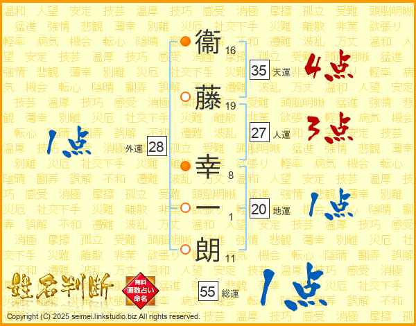 衞(16画)藤(19画) 幸(8画)一(1画)朗(11画)