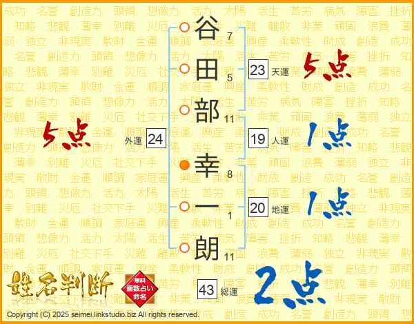 谷(7画)田(5画)部(11画) 幸(8画)一(1画)朗(11画)
