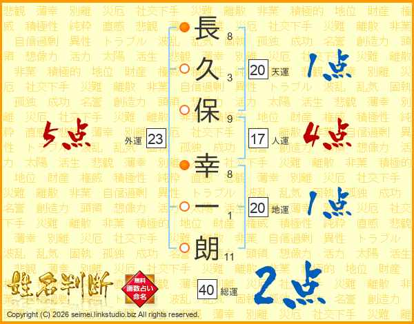 長(8画)久(3画)保(9画) 幸(8画)一(1画)朗(11画)