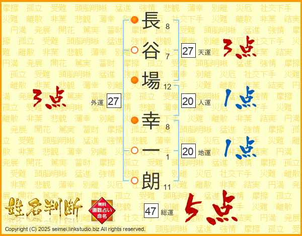 長(8画)谷(7画)場(12画) 幸(8画)一(1画)朗(11画)