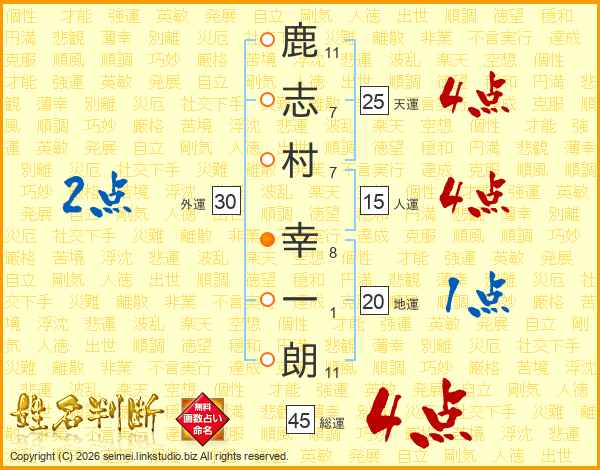 鹿(11画)志(7画)村(7画) 幸(8画)一(1画)朗(11画)