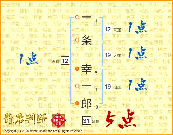 一(1画)条(11画) 幸(8画)一(1画)郎(10画)