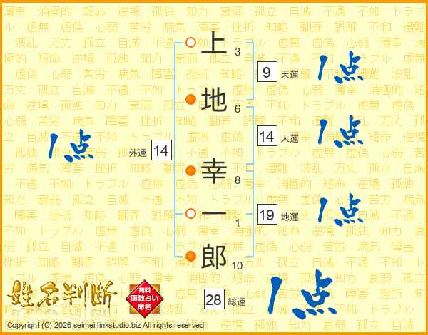 上(3画)地(6画) 幸(8画)一(1画)郎(10画)