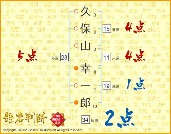 久(3画)保(9画)山(3画) 幸(8画)一(1画)郎(10画)