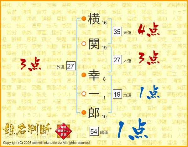 横(16画)関(19画) 幸(8画)一(1画)郎(10画)