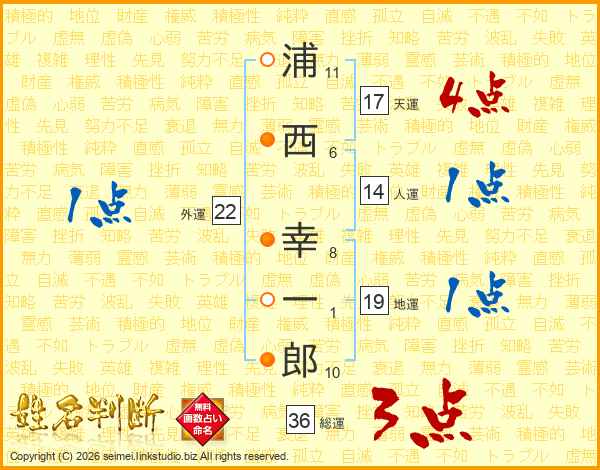 浦(11画)西(6画) 幸(8画)一(1画)郎(10画)