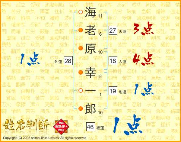 海(11画)老(6画)原(10画) 幸(8画)一(1画)郎(10画)