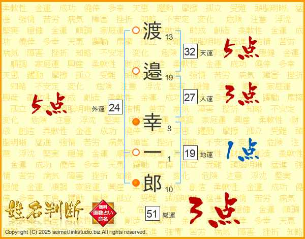 渡(13画)邉(19画) 幸(8画)一(1画)郎(10画)