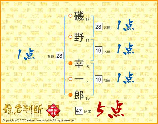 磯(17画)野(11画) 幸(8画)一(1画)郎(10画)