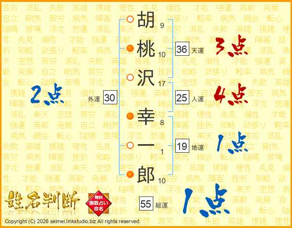胡(9画)桃(10画)沢(17画) 幸(8画)一(1画)郎(10画)