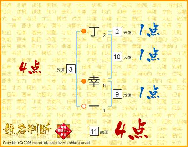生活面を象徴する運勢です。外部から受ける影響力を表し、結婚運、家庭運や職場、環境への順応性を表します。総運から人運を引いた画数。姓や名が1文字の場合を除く。