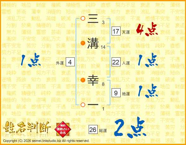 生活面を象徴する運勢です。外部から受ける影響力を表し、結婚運、家庭運や職場、環境への順応性を表します。総運から人運を引いた画数。姓や名が1文字の場合を除く。