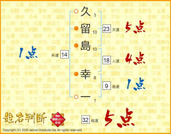 久(3画)留(10画)島(10画) 幸(8画)一(1画)