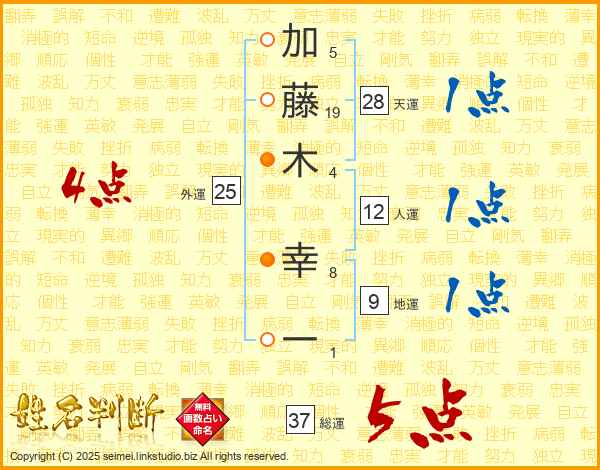 加(5画)藤(19画)木(4画) 幸(8画)一(1画)