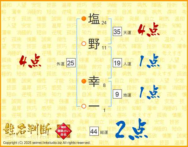 生活面を象徴する運勢です。外部から受ける影響力を表し、結婚運、家庭運や職場、環境への順応性を表します。総運から人運を引いた画数。姓や名が1文字の場合を除く。