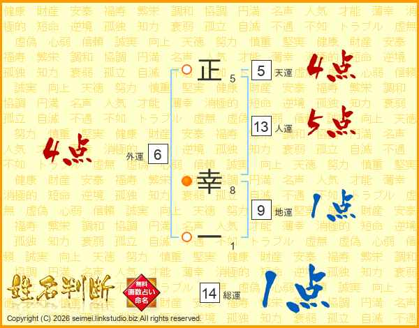 生活面を象徴する運勢です。外部から受ける影響力を表し、結婚運、家庭運や職場、環境への順応性を表します。総運から人運を引いた画数。姓や名が1文字の場合を除く。