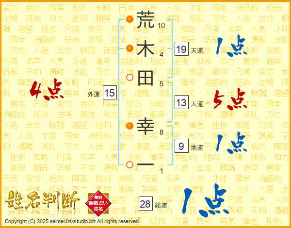 荒(10画)木(4画)田(5画) 幸(8画)一(1画)