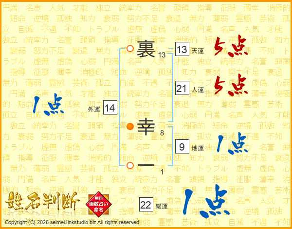 生活面を象徴する運勢です。外部から受ける影響力を表し、結婚運、家庭運や職場、環境への順応性を表します。総運から人運を引いた画数。姓や名が1文字の場合を除く。
