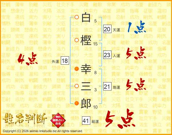 白(5画)樫(15画) 幸(8画)三(3画)郎(10画)