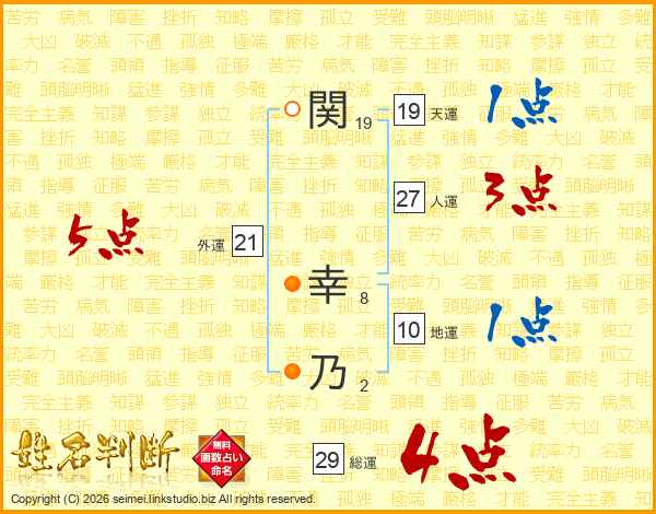 生活面を象徴する運勢です。外部から受ける影響力を表し、結婚運、家庭運や職場、環境への順応性を表します。総運から人運を引いた画数。姓や名が1文字の場合を除く。
