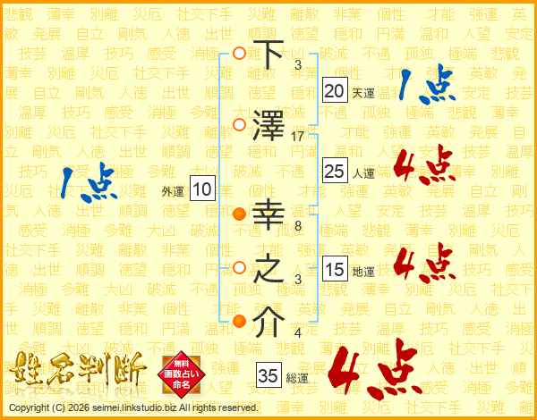 下(3画)澤(17画) 幸(8画)之(3画)介(4画)