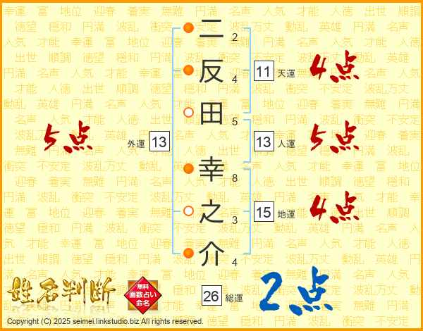 生活面を象徴する運勢です。外部から受ける影響力を表し、結婚運、家庭運や職場、環境への順応性を表します。総運から人運を引いた画数。姓や名が1文字の場合を除く。