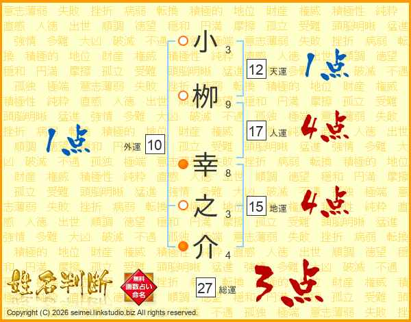 小(3画)栁(9画) 幸(8画)之(3画)介(4画)