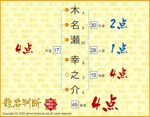 木(4画)名(6画)瀬(20画) 幸(8画)之(3画)介(4画)