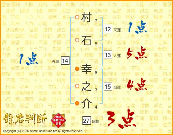 村(7画)石(5画) 幸(8画)之(3画)介(4画)