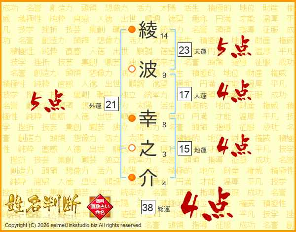 綾(14画)波(9画) 幸(8画)之(3画)介(4画)