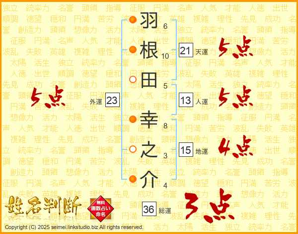 羽(6画)根(10画)田(5画) 幸(8画)之(3画)介(4画)