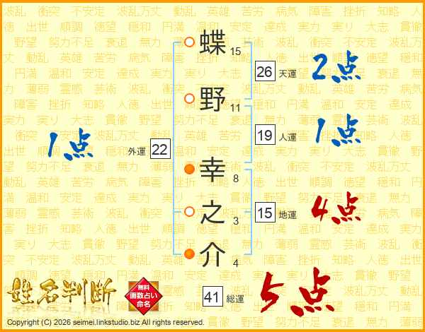 蝶(15画)野(11画) 幸(8画)之(3画)介(4画)