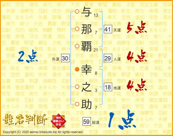 与(13画)那(7画)覇(21画) 幸(8画)之(3画)助(7画)