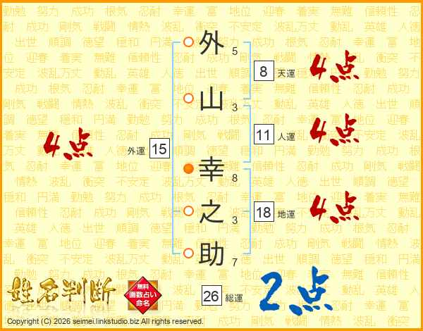 外(5画)山(3画) 幸(8画)之(3画)助(7画)