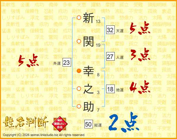 新(13画)関(19画) 幸(8画)之(3画)助(7画)