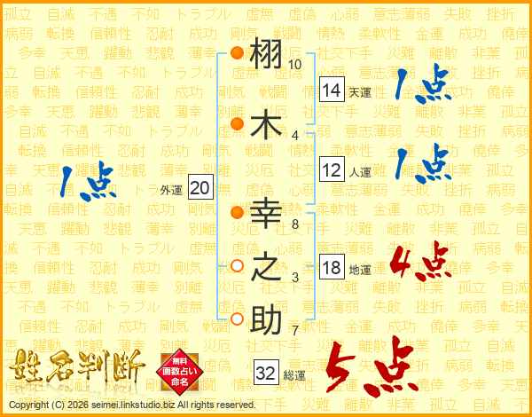 栩(10画)木(4画) 幸(8画)之(3画)助(7画)