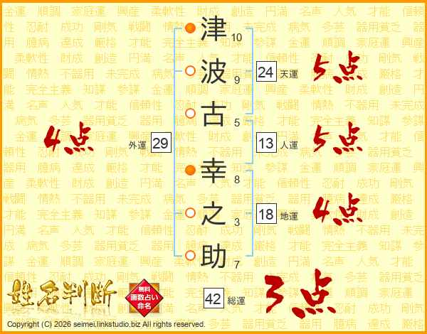 津(10画)波(9画)古(5画) 幸(8画)之(3画)助(7画)