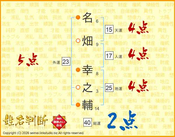 名(6画)畑(9画) 幸(8画)之(3画)輔(14画)