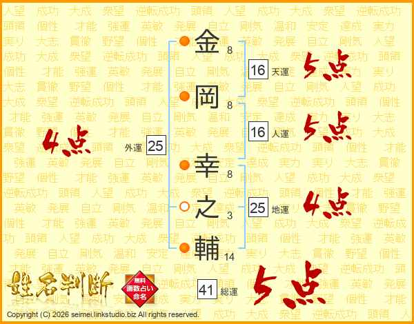 金(8画)岡(8画) 幸(8画)之(3画)輔(14画)