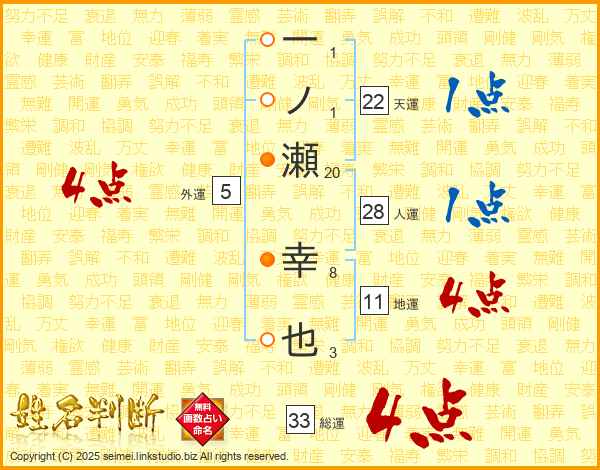 一(1画)ノ(1画)瀬(20画) 幸(8画)也(3画)
