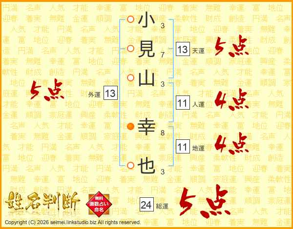 小(3画)見(7画)山(3画) 幸(8画)也(3画)