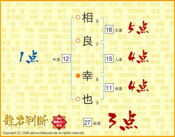 生活面を象徴する運勢です。外部から受ける影響力を表し、結婚運、家庭運や職場、環境への順応性を表します。総運から人運を引いた画数。姓や名が1文字の場合を除く。